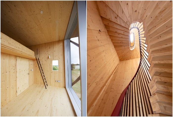 Огромный резервуар, который раньше использовали для воды, полностью адаптировали под жилую зону, превратив в панорамную гостиную открытой планировки с потрясающим видом на окружающий пейзаж. Задействовали и крышу, где расположены солнечные панели, плоские емкости для воды и большая смотровая площадка, которую можно использовать в качестве зоны отдыха и принятия солнечных ванн.