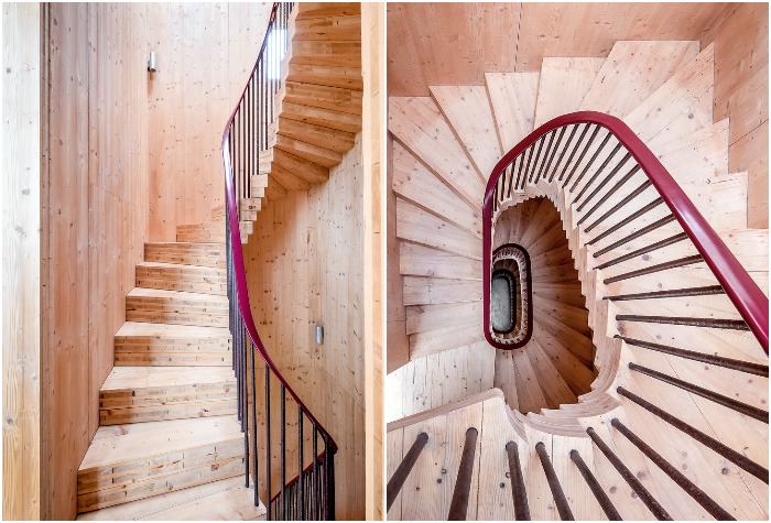 Благодаря новому объему, который строили местные мастера, удалось разделить пространство на две башни. В одной – обустроили жилую резиденцию, а вторая – является лестничной башней, обеспечивающей доступ на все этажи. Жилая часть разделена на три этажа с двухуровневыми пространствами. На нижнем этаже обустроили прихожую и кухню-столовую, а вот на втором уровне нашлось место для игровой зоны. Два последующих этажа отданы под спальные комнаты и ванные. В них также имеется «чердачное» пространство, которые можно использовать как дополнительные спальные зоны, а остальную площадь приспособить под рабочий кабинет или студию.