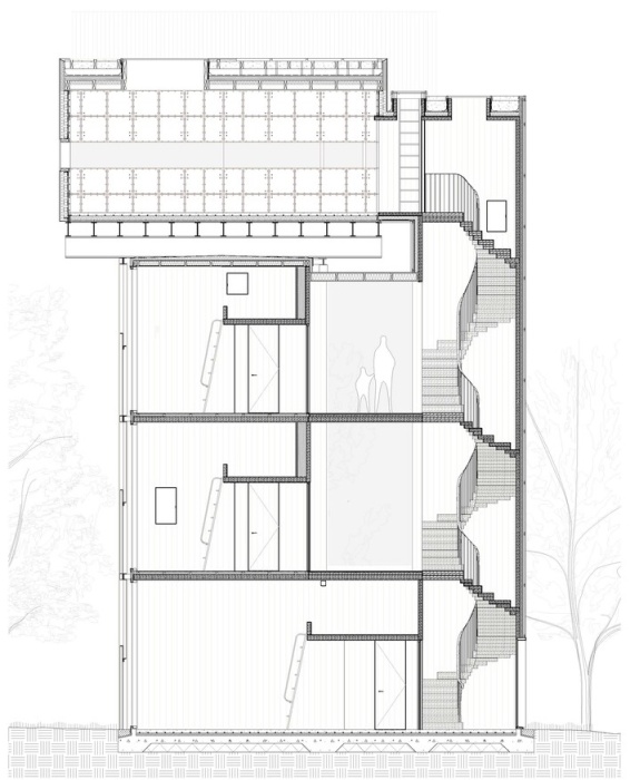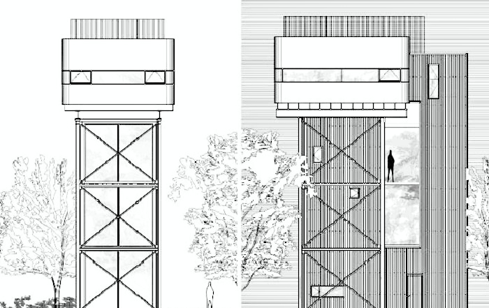 Стоит отметить, что впечатляющая металлическая масса перемежается застекленными пролетами между двумя средними уровнями и множеством оконных проемов, разных размеров на восточной и западной стороне. А также ленточным окном, обрамляющим верхний объем и полным остеклением южного фасада. Благодаря грамотной трансформации заброшенного сооружения удалось создать настоящий архитектурный ансамбль, в котором «16-метровая водонапорная башня становится частью здания, частью пейзажа и особенным элементом скульптуры таким образом, что каждый из этих трех аспектов неразделим».