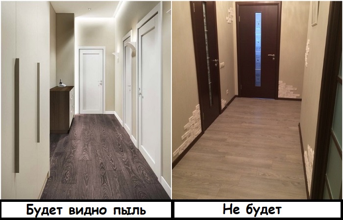 Здесь ситуация примерно такая же, как и с плиткой. Любое напольное покрытие темного цвета – это лишняя головная боль и ежедневная уборка. Грязь на таком покрытии видна сразу и постоянно, но, в отличие от плитки, которая нормально относится к влажным уборкам, ламинат их терпеть не может. Чем чаще вы будете устранять загрязнения с помощью швабры, тем быстрее он придет в негодность. Поэтому если вы уже решили постелить в коридоре ламинат, хотя бы выбирайте светлые модели – на них не так заметны грязь и пыль.