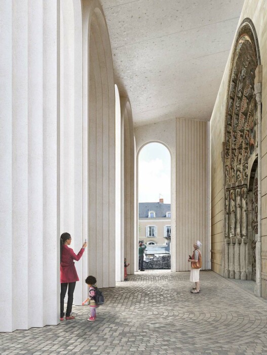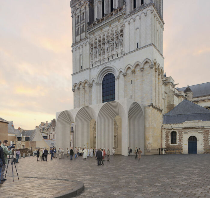 Известная архитектурная компания Kengo Kuma & Associates решила привнести свою лепту в оформление готического собора в старинном французском городе Анже. В скором времени вход в Анжеский кафедральный собор будет украшать эффектное арочное дополнение, на которое возлагается сразу несколько функций. Приоритетом, конечно же, является защита части фасада старинной святыни от внешних воздействий, при этом пять арок образуют новую галерею, создающую своеобразный портал между прошлым, настоящим и будущим.