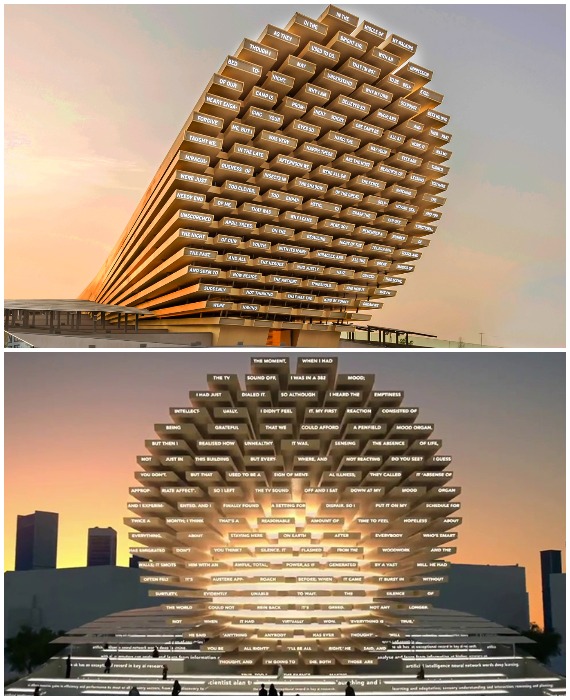 Британские архитекторы представили эффектное сооружение, напоминающее гигантскую кучу массивных досок, на торце которых можно увидеть обрывки фраз. Если же все-таки присмотреться, то получится прочитать стихотворение, написанное искусственным интеллектом.