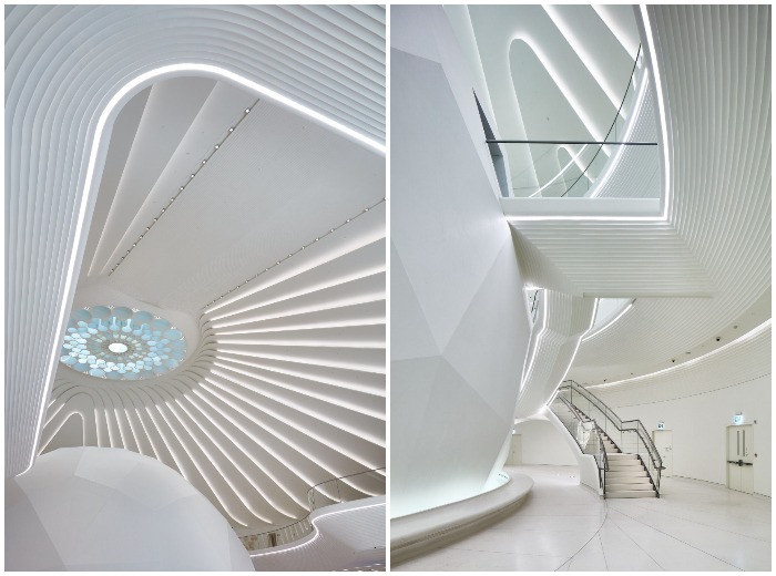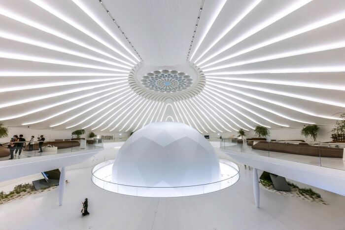 Белоснежные тона, футуристические формы лестниц и переходов стали украшением внутреннего пространства павильона (Дубай, ОАЭ).