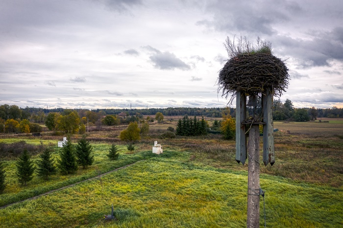 Теперь вместо деревни дикое поле, художественная инсталляция и аист со своим семейством («Русская Хатынь», Ленинградская область).
