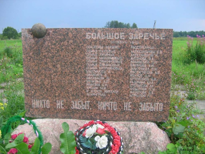 Историческая справка: 29 октября 1943 г. для 66 жителей села Большое Заречье стал роковым. Именно в этот день их населенный пункт постигла та же участь, что и Хатынь. За пособничество партизанам и массовый отказ от отправки на работу в Германию немецкие каратели окружили деревню и сожгли все подворья. Спастись бегством удалось немногим. Большинство жителей, среди которых были лишь старики, женщины и 19 детей, согнали в соседнее село Глумицы. Там их заперли в одном сарае и сожгли. С тех пор в Большом Заречье жизнь так и не возродилась. Сразу после войны среди выжженного поля был установлен обелиск с надписью: «Здесь были сожжены жители деревни».