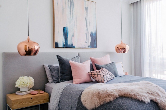 Эти два цвета прекрасно дополняют и подчеркивают друг друга: серый становится менее формальным, а розовый – более серьезным к тому же получает недостающую выразительность. Самыми удачными для интерьера станут приглушенные оттенки – пыльная роза, карамельный розовый. Используйте выбранный цвет для акцентной стены, аксессуаров, обивки мягкой мебели. Данная комбинация подходит для комнат, в которые вы хотите добавить игривость и легкость – спальня, ванная, детская.