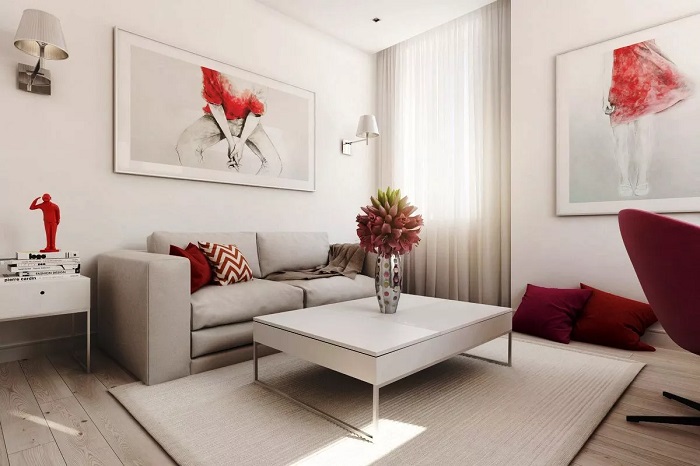 Если ваш интерьер оформлен в светло-серых тонах, разбавьте его холодным красным цветом, который идеально подходит для создания акцентов. В случае, когда в комнату попадает много солнечных лучей и грамотно организовано искусственное освещение, можно использовать красный не в одном, а в нескольких элементах. Например, добавить в виде вазы на стеллаж, выбрать подушки с подходящим узором, создать композицию на журнальном столике и пр. Обратите внимание, что акценты не должны быть сосредоточены в одном месте – их следует равномерно распределять по всей площади комнаты. Также удачным будет сочетание серого и красных кирпичных стен в интерьере в стиле лофт.