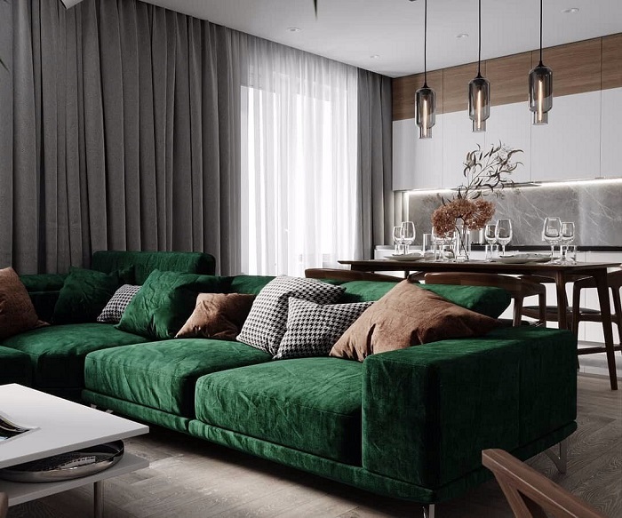 Изумрудный диван станет акцентом в комнате. / Фото: almode.ru