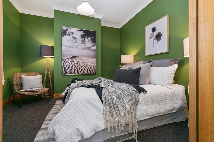 Травянисто-зеленые стены в спальне. / Фото: almode.ru