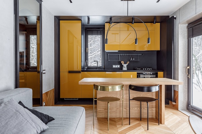 На заметку: Людям, который считают желтый слишком ярким, можно обратить внимание на золотистый. Этот оттенок приятно перекликается со светлыми и темными тонами, делая интерьер изысканнее и роскошнее. Золотистый светильник, ножки на журнальном столе, фурнитура на двери и мебели – выбирайте подходящий вариант и включайте его в интерьер.