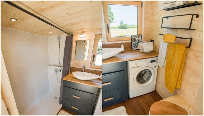 Обустройство ванной комнаты очень порадовало Брабару. Поскольку она пожелала, чтобы эта зона была максимально просторной, специалисты компании Baluchon уменьшили жилую зону. Благодаря увеличению пространства, в ванной удалось установить раковину с тумбой, полноценную стиральную машину с сушилкой, биотуалет и душ размером 1,6 х 0,8 м. Также задействовали и вертикальные поверхности, где имеются полотенцесушители, открытые полки и большое зеркало.
