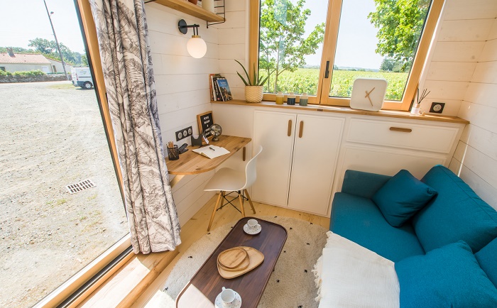 Многофункциональная гостиная позволит отдохнуть, наслаждаясь пейзажем за панорамным окном и плодотворно поработать (модель The ia Orana). | Фото: tinyhouse-baluchon.fr.