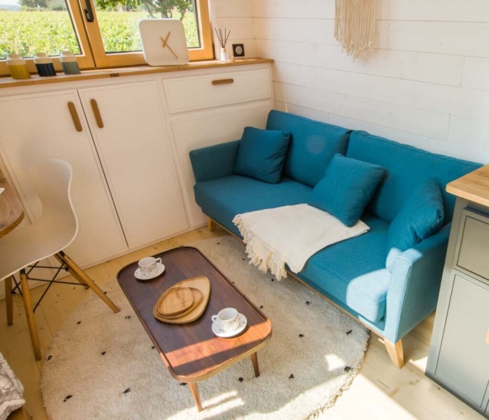В самом крошечном домике предусмотрена уютная гостиная, которая одновременно служит столовой, офисом и гостевой спальней. Удобный и стильный диван, со скрытыми ящиками для хранения, небольшой журнальный столик, встроенная дубовая тумба под боковым окном и рабочий стол в углу – все это позволяет и отдохнуть, любуясь пейзажем, и поработать, во время изоляции, например.