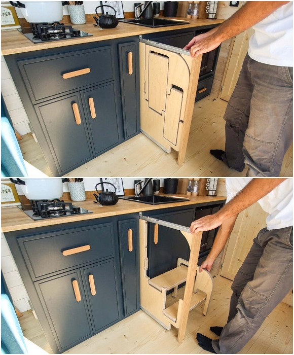 Рядом с гостиной обустроена полноценная кухня с многофункциональным мебельным гарнитуром, где поместились: мойка, газовая варочная поверхность, рабочая зона, морозильная камера, полки и выдвижные ящики для кухонной утвари и столовых приборов. Здесь также имеется трехуровневый шкаф для хранения банок, который можно считать кладовкой. Предусмотрительные разработчики внедрили еще одну интересную деталь, чтобы хозяйка могла добраться до навесных шкафов под потолком. В напольной тумбе они установили выкатную лестницу с двумя складывающимися ступенями.