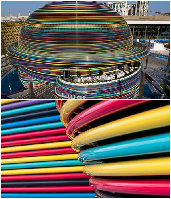 Фасад павильона «завернут» в разноцветные трубы-нити, диаметром 8 см (Dubai Expo 2020).