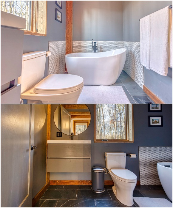 Благоустроенная ванная комната, расположена между двумя спальнями (Catskills Cabin, Кэтскилл). | Фото: thebackcountryhutcompany.com.