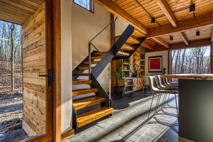 Лестница, ведущая на второй этаж, привнесла нотку индустриального стиля в интерьер загородного дома (Catskills Cabin, Кэтскилл). | Фото: escapebrooklyn.com.