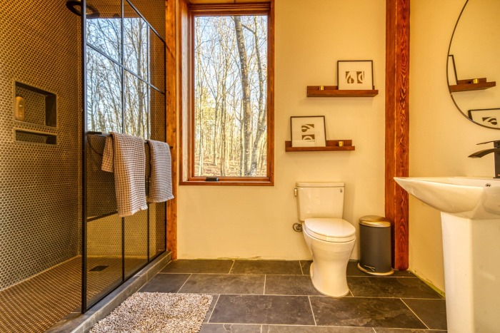 Интерьер ванной комнаты, расположенной на первом этаже загородного дома Catskills Cabin (Кэтскилл, США).