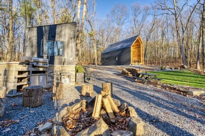 Интересный способ хранить дрова для сауны и костра зоны барбекю, где можно пожарить мясо и овощи (Catskills Cabin, Кэтскилл). | Фото: newatlas.com.