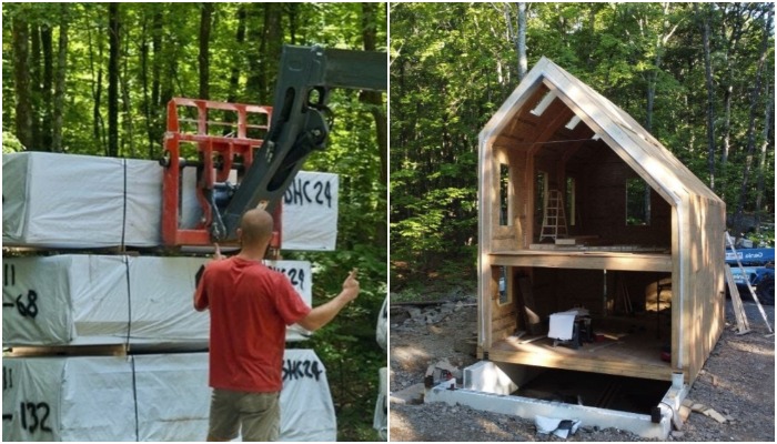 Панели дома собираются на производстве и в готовом виде доставляются на место установки, что в разы сокращает время строительства (Catskills Cabin, Кэтскилл).