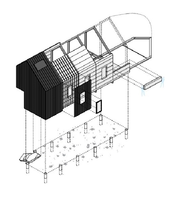 Конструкционные особенности: Каркас сборно-разборного дома сделан из клееного бруса, покрытого ламинированными панелями. Для того чтобы строение можно было собрать в кратчайшие сроки, не только стены состоят из утепленных панелей, но и крыша, и полы. Все элементы конструкции собираются на заводе, чтобы доставить их на место стройки в готовом виде. Как утверждают разработчики, для каркаса и производства панелей частично был использован восстановленный древесностружечный материал, остальная древесина прошла экологический контроль.