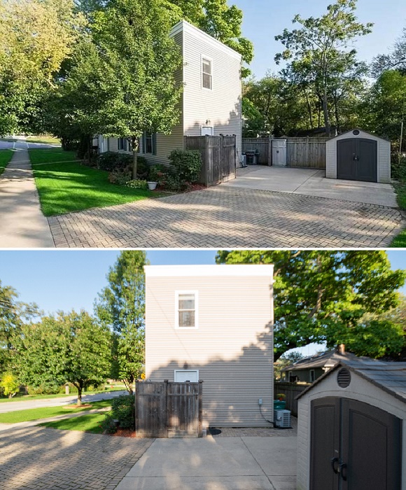 Не только фантазия архитекторов и владельцев частных домов толкает на строительство невероятных зданий, которые, если и не вызывают бурю протеста, так сражают наповал. Взять, к примеру, дом, появившийся на одной из улиц американского городка Дирфилд. Если смотреть на фасад здания с противоположного тротуара, то ничего особенно не заметишь, но если волею судеб оказаться с торцевой стороны дома – изумлению не будет предела, ведь его ширина составляет всего лишь 90 см.