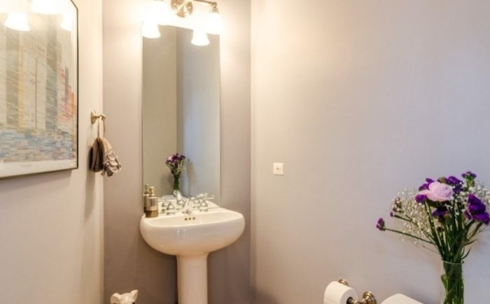 А вот в самой узкой части дома находится один из санузлов. На втором этаже обустроены две спальни из трех, к которым прилагается довольно просторная и благоустроенная ванная комната. Зная о нестандартной геометрии помещений, не лишним будет упомянуть, что интерьер оформлен в минималистском стиле, чтобы не перегружать пространство.
