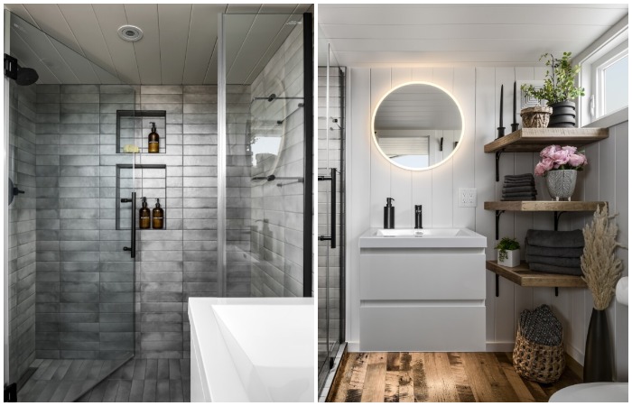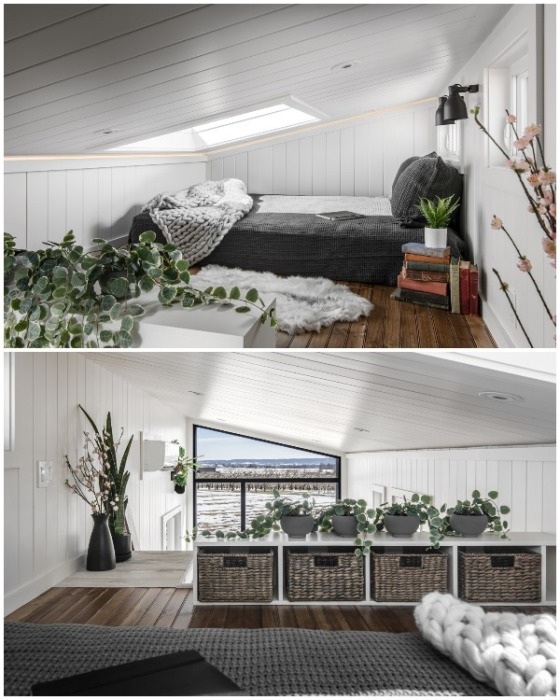 Полностью оборудованная ванная комната удовлетворит даже избалованных цивилизацией любителей уединения на природе (The Luna, США). Чтобы владельцы крошечного дома не были ограничены в привычных для современного человека удобствах, в мини-апартаментах предусмотрена и полноценная ванная комната. Биотуалет, раковина с тумбой, просторный душ, открытый стеллаж для хранения вещей, моющих и косметических средств – всего этого вполне достаточно для того, чтобы добровольные отшельники жили в комфорте. Учитывая ограниченное пространство, в «Луне» есть только одна спальня, в которую можно попасть по лестнице со встроенной кладовкой. Сама по себе спальная зона – это типичное чердачное пространство с низким потолком, где есть место для двуспальной кровати и комода. Поскольку спальня находится в глубине домика, чтобы она не оказалась в темноте, предусмотрено мансардное окно, которое можно открыть и наслаждаться свежим воздухом, пением птиц или звездным ночным небом.