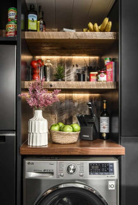 Мини-кладовка встроена над стиральной машиной, чтобы не занимала драгоценное пространство (The Luna, США). | Фото: ca.movies.yahoo.com.