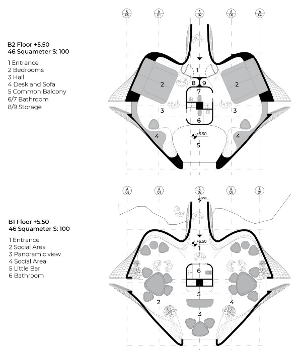 Следуя намеченным принципам, специалисты компании разместили модули-бабочки на склоне горы, примыкающей к музею Ниволы. При этом модульные домики разбросаны в шахматном порядке, чтобы обеспечить свободный доступ к каждому строению и прекрасными видами из окон. Смелым шагом в установке домиков, которых должно быть не менее 14, стало отсутствие главных архитектурных элементов –внутренних лестниц. В это сложно поверить, но в модуле новой формации нет лестниц внутри разноуровневых помещений. Пока только посетителям (впоследствии и жильцам) рекомендуется использовать естественный рельеф холма для доступа на разные этажи, хотя, если склон очень крутой, то к главному входу может быть пристроена лесенка. Также разработчики предусматривают гибкость объема структур и их свободную планировку, что позволит расширить круг их использования и месторасположение.