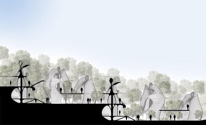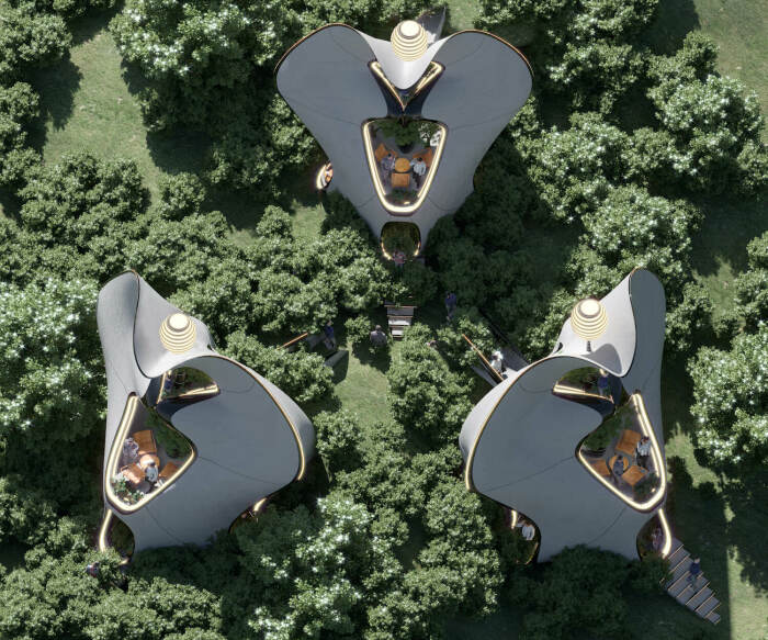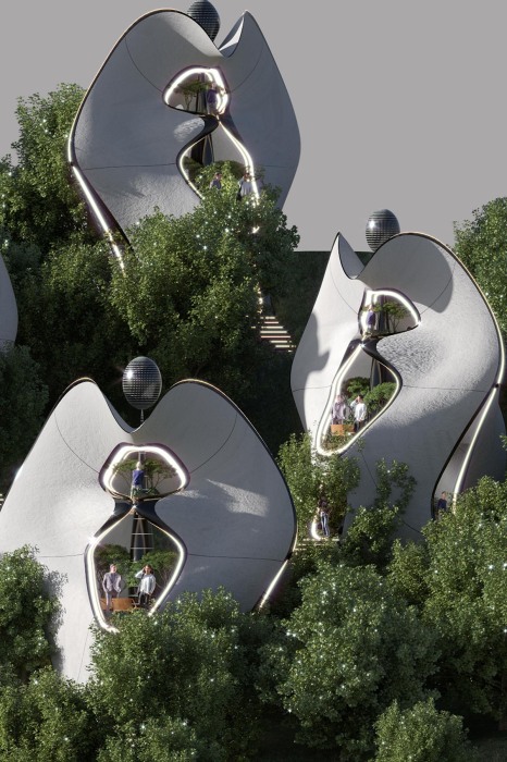 По сведениям авторов Novate.ru, третий этаж неординарного домика может быть соединен на этом же уровне с другими модулями для создания общей социальной зоны, что очень удобно, если «бабочки» планируют использовать в качестве эко-отеля. Прелесть этой разработки состоит в том, что несколько модулей можно распределять в соответствии не только с ландшафтом, но и функциональностью, образовывая кластеры вокруг одного домика, который может выполнять функции общих зон пользования: лаунж-зоны, тренажерного зала, ресторана и сауны/СПА, например. Это поспособствует социальному взаимодействию людей, обитающих в населенном пункте или отдыхающих в эко-отеле постояльцев, и избавит от необходимости строить несколько заведений. Прогнозируют, что неординарные лесные хижины, похожие на гигантских бабочек, очень быстро станут трендом в эко-строительстве, хотя не исключено, что они так и останутся эксклюзивным шедевром дизайнерского ремесла.