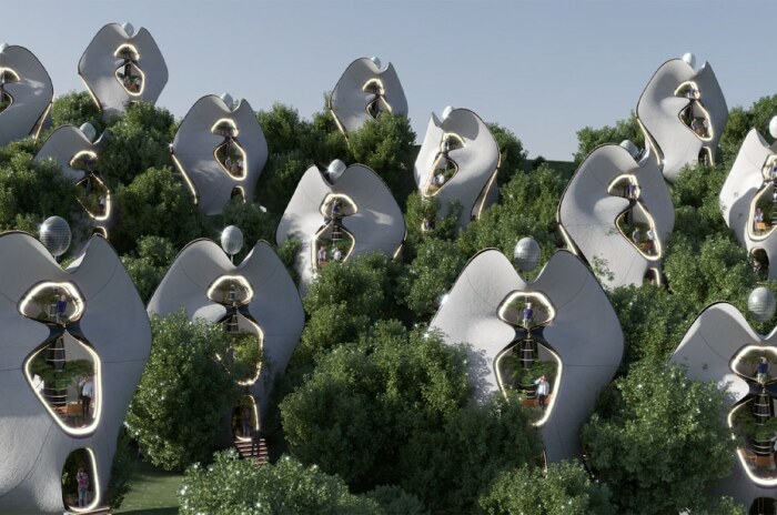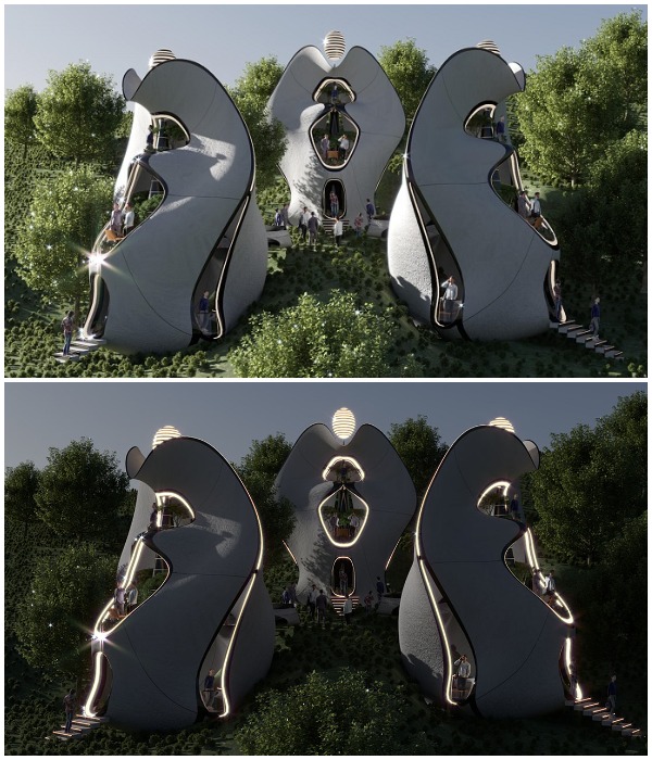На каждом модуле Exosteel имеется энергетическая башня, которая позволит организовать автономное жилище. | Фото: mymodernmet.com.