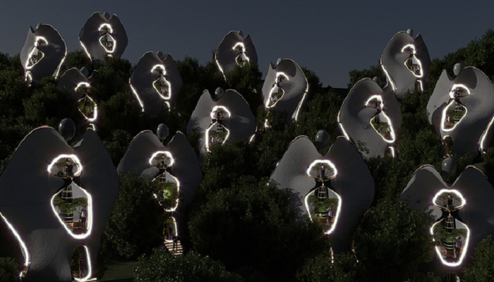В темное время суток деревня превращается в сверкающий яркими огнями арт-объект (Exosteel). | Фото: worldarchitecture.org.