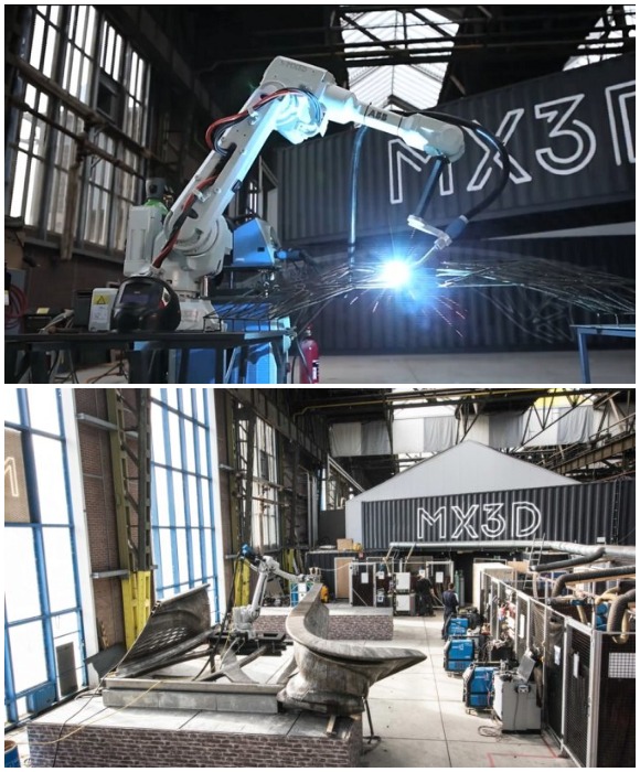 Справка: Для 3D-печати использовалось промышленное роботизированное оборудование KUKA robot arm, разработанное голландской компанией MX3D. Корпус, конструкционные детали колонн, несущих балок и опорных элементов создаются с помощью лазерного инструмента оснащенного роботизированной рукой KUKA со встроенным программным обеспечением WAAM, которая использует для печати специально разработанный стальной порошок.