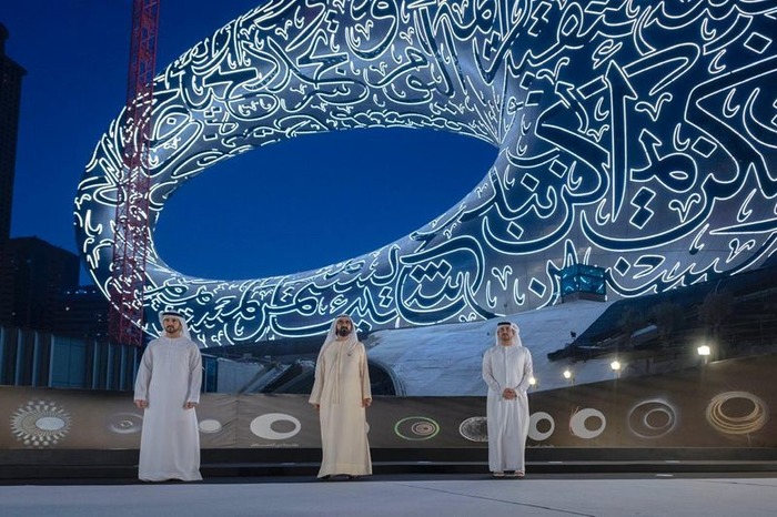 Но главный интерес, не считая экспозиций, представляет именно фасад здания. Его украсили арабской каллиграфией, которую выполнил эмиратский художник Маттаром бен Лахеджем. Но это не просто набор слов: на сооружение поместили цитаты шейха Мухаммеда бен Рашида Аль Мактума, вице-президента, премьер-министра ОАЭ и правителя Дубая. Например, там можно найти такое высказывание: «Будущее принадлежит тем, кто может его вообразить, спроектировать и построить. Будущее не ждет, его можно воплотить в жизнь уже сегодня». Несмотря на то, что сооружение ещё заканчивали в прошлом году, оно уже успело занять место в рейтинге самый красивых музейных зданий планеты.