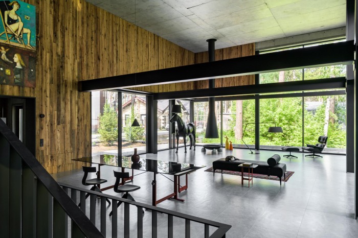 Панорамные окна, стирающие грань между внутренним пространством и природой, необлицованный бетон, стальные балки, деревянные панели из необработанного апшеронского дуба, большой черный камин нетривиальной формы (проект разрабатывал тоже сам хозяин), коллекционная итальянская мебель, раритетное кресло Lounge Chairand Ottoman, которых в мире не так уж и много, и то выставляются в музеях дизайна – вот и весь перечень убранства гостиной. Судя по всему, главным «героем» этого пространства все-таки является торшер, созданный голландской компанией Moooi в виде полноразмерного коня под названием Horse Lamp от Front. Элегантный красавец настолько привлекает внимание, что все, кто первый раз попадает в удивительный дом, совсем не замечают, что это торшер и норовят на него взобраться (хозяин пресекает такие поползновения на корню).