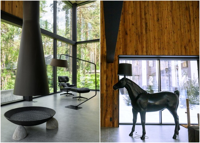 Эффектный камин и черный конь (арт-объект и торшер в одном лице или морде) стали главным украшением гостиной.