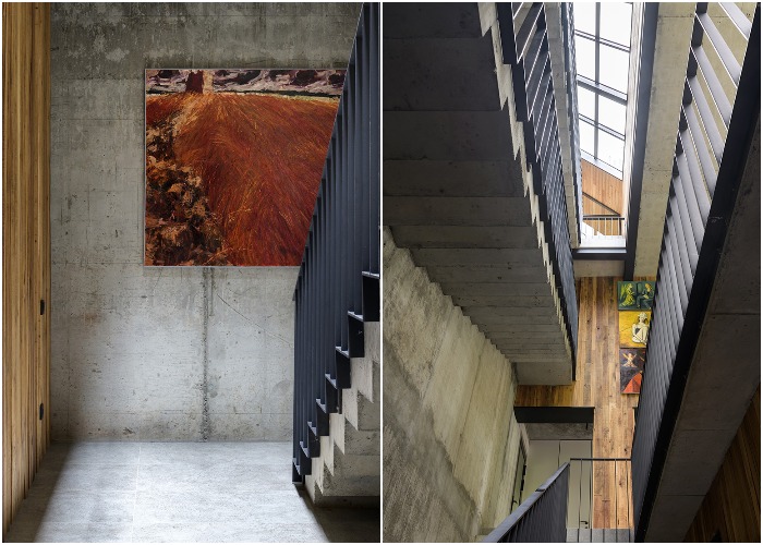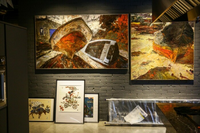 Больше всего декоративных элементов можно увидеть на стенах массивных лестничных маршей. Они превращены в своего рода галерею, в которой представлены работы местных художников Александра Шурица, Михаила Казаковцева и Елены Бобровой из Омска. Именно произведения сибирских художников стали главным украшением бетонных или кирпичных стен дома. По этому поводу Юрий Куликов сказал: «Неважно из чего стена, главное — чтобы на ней висело хорошее произведение искусства».