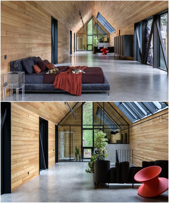 Нет ничего лишнего и в спальне, площадь которой достигает 165 кв. метров! Именно она и находится в «парящем» модуле, что позволило надежно спрятаться от любопытных глаз, не прибегая к роллетным шторам. Учитывая высоту объекта, хозяин может спокойно находиться в спальне с открытыми окнами, не переживая за уединение, при этом беспрепятственно любоваться верхушками сосен. Несмотря на внушительные габариты спального пространства, здесь можно увидеть лишь большую кровать, оригинальный шкаф вдоль стены, ванную комнату, спрятанную за стеклом и кресло-волчок Spun от итальянской фабрики Magis, которое стало единственным ярким пятном в интерьере, где преобладает дерево, только на этот раз доска ольхи.