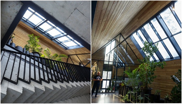 Кстати сказать, несмотря на обширное остекление, внушительную площадь и высоту четырехуровневого дома в нем можно увидеть лишь один вертикальный радиатор и только у входа, в остальных же комнатах предусмотрена система «теплый пол», которая поддерживает комфортную температуру несмотря на суровые зимы.