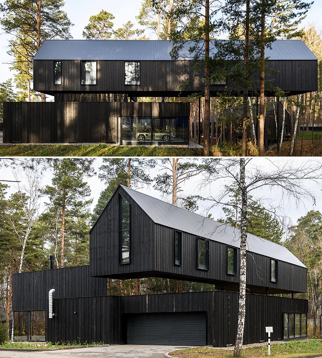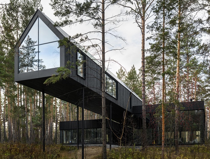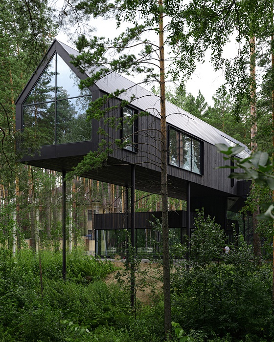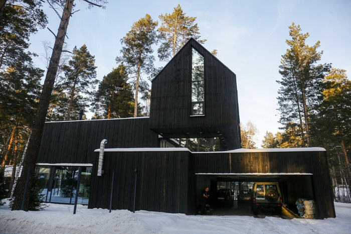 Заезжая в элитный коттеджный поселок «Европейский», что в Заельцовском районе Новосибирска, среди вековых сосен нельзя не заметить удивительный черный дом, «парящий» над оврагом. Вернее сказать, его консольная часть производит неизгладимое впечатление на тех, кто впервые собственными глазами видит такую конструкцию здания. Как оказалось, неординарный проект разработал известный в Новосибирске дизайнер и архитектор Юрий Куликов, который использует левитирующий дом не только как жилище.