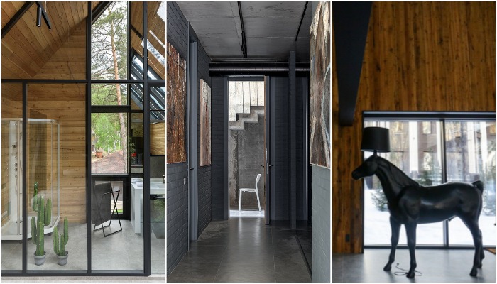 Обилие стекла, чтобы «природа могла зайти в дом», большой массив древесностружечных материалов, поддерживающие металлоконструкции, наличие бетонных несущих стен – всего этого оказалось достаточно, для того, чтобы создать эффектный дом, который идеально вписался в окружающий ландшафт. Если с экстерьером все предельно понятно, стекло, зеркальные панели и натуральное дерево, окрашенное в черный цвет, то внутри можно найти неожиданные сочетания, которые и привносят неповторимую атмосферу, позволяющую талантливому владельцу отдохнуть от городской суеты и общения с массой людей.