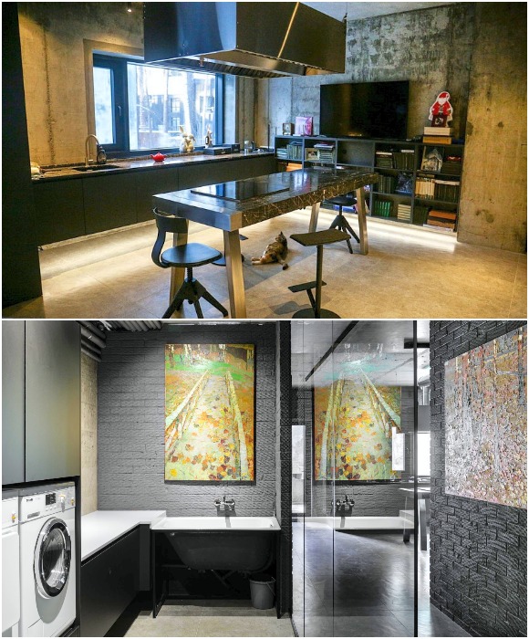 Остальное же пространство выделено под организацию профессиональной кухни, где кулинарные изыски готовит сам хозяин, прачечную и особую гордость Юрия – музыкальный зал. В нем установлена различная аудиоаппаратура, которая дает возможность послушать музыку на любом носителе, начиная с виниловых пластинок из его внушительной коллекции (около 5 тысяч!). Там же имеется гигантские колонки, барабанная установка и другие музыкальные инструменты, в том числе, контрабас, на котором он сам играет под настроение.