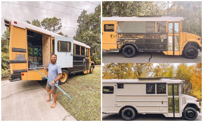 Всего за 2,5 месяца энтузиастам удалось преобразовать списанный школьный автобус в благоустроенный дом на колесах (штат Флорида, США).