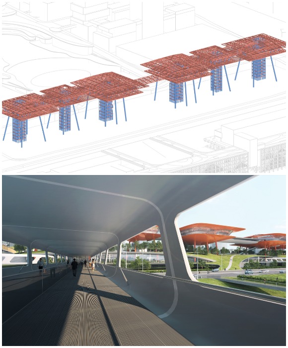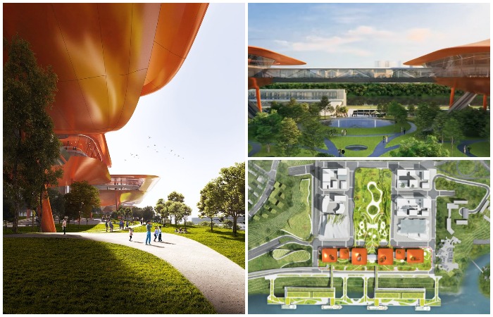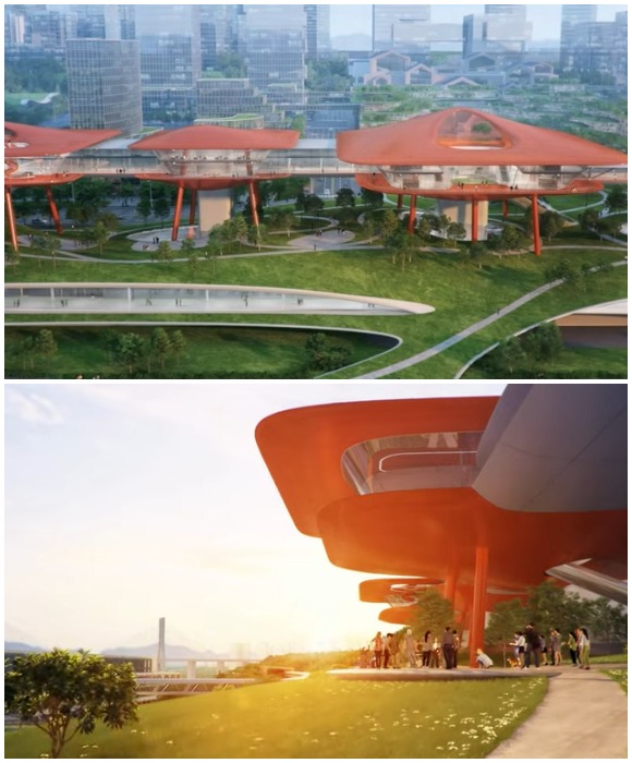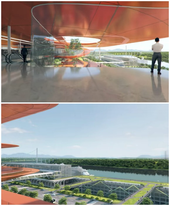Из павильонов, мостиков и переходов открывается восхитительный вид на реку, парк и окрестности (концепт The Cuntan International Cruise Centre).