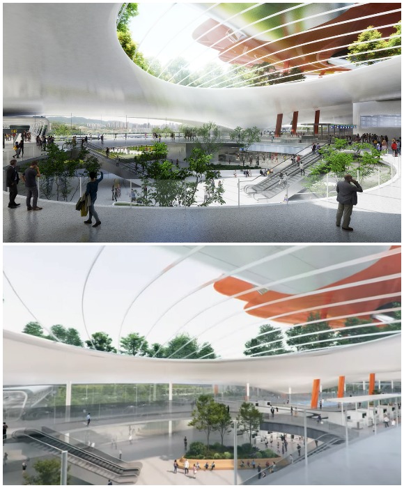 Проектом предусмотрены подземные пространства со световыми люками, выходящими в парк (концепт The Cuntan International Cruise Centre).
