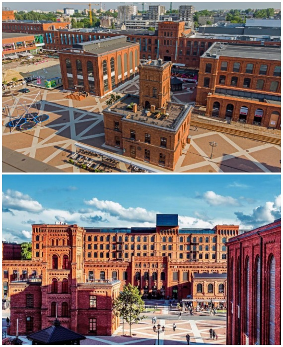 Новые владельцы постарались полностью сохранить промышленную архитектуру начала XX века, несмотря на то, что это современный культурно-развлекательный центр (Лодзь, Польша).