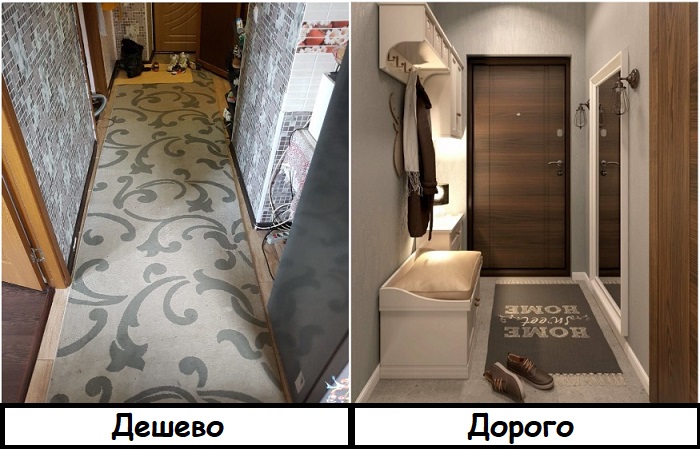 Ковры действительно добавляют помещению уюта и помогают сделать интерьер завершенным, но лишь в том случае, если они качественные и лежат в жилых комнатах. Придверные коврики, а также дорожки в стиле СССР убивают эстетику прихожей, собирая на себе всю пыль и грязь, а уже через пару недель приходят в негодность. Учитывая тот факт, что знакомство с квартирой начинается именно с прихожей, подобный элемент сведет на нет все ваши усилия по созданию уютной атмосферы. Лет 20-30 назад такие дорожки использовали практически в каждой хрущевке, чтобы спрятать щели или некрасивый пол, создать хотя бы какое-то подобие звукоизоляции. Однако сейчас в этом нет никакой необходимости – нагромождение разношерстных ковров свидетельствует о бедности и безвкусице. Если вы все же хотите, чтобы в коридоре был коврик на входе, выбирайте качественные, практичные модели, которые вписываются в интерьер комнаты.