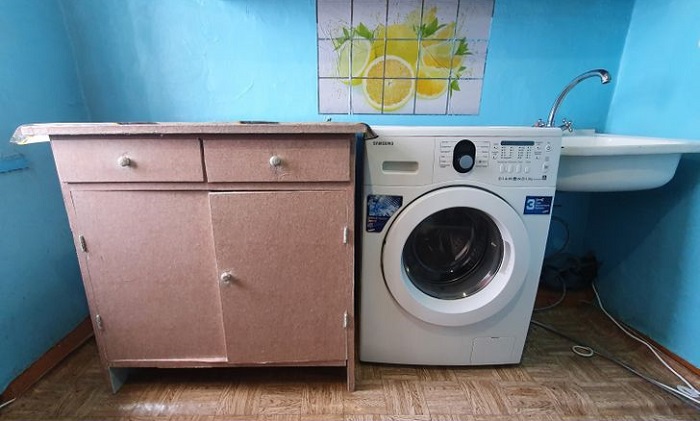 Новая стиральная машина в ванной с советским ремонтом смотрится странно