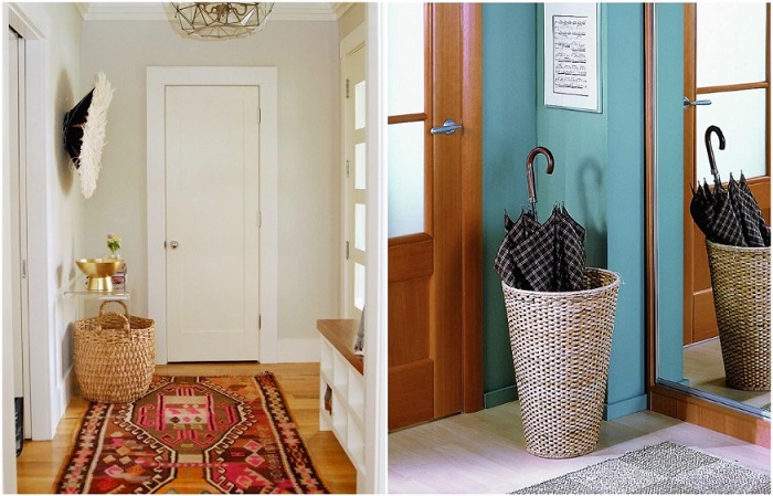 Продолжая тему корзин, стоит упомянуть напольные модели, по типу тех, которые вы покупаете для ванной комнаты. Купите красивый плетеный вариант и поставьте в свободном углу. Выбирайте настолько большую корзину, насколько позволяет метраж коридора, чтобы она смогла вместить в себя максимум вещей. Обычно подобные вещи дизайнеры советуют использовать для хранения немнущихся или сезонных вещей, например, головных уборов, зонтов. При желании в корзину можно складывать обувь или тонкие куртки, которые не займут много места. Также она подойдет в качестве дополнительного места для детских игрушек, которые вы с ребенком берете на улицу, или для личных вещей ваших домашних питомцев – поводков, одежды и пр. Обратите внимание: Даже если вы купили модель из влагостойкого материала, в ней стоит хранить исключительно сухие вещи, чтобы от влаги не образовалась плесень.
